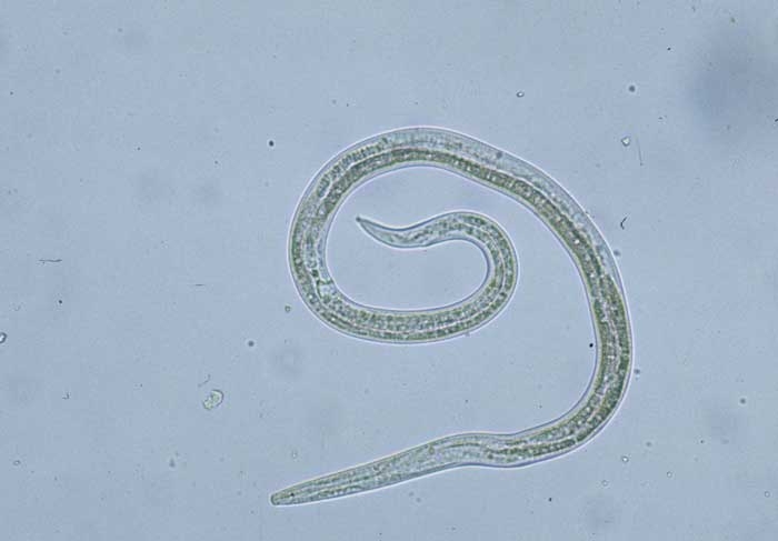 Les taches polygonales traduisant la présence de ce nématode foliaire dans le limbe sont très caractéristiques (figures 1 à 3) et sont à l'origine du nom de cette affection "maladie des taches foliaires en damier». Elles apparaissent d'abord sur les feuilles basses. Leur couleur est d'abord jaunâtre à vert clair puis évolue vers le brun sombre et, parfois même, vers le noir. Ces taches sont toujours délimitées par les nervures, ce qui est à l'origine de leur aspect polygonal. Cette maladie vermiculaire, due à Aphelenchoides ritzemabosi (figure 4) et affectant plutôt le chrysanthème, est assez peu fréquente en France. Elle a surtout été signalée dans le Sud-Ouest, et plus particulièrement dans le département des Pyrénées Atlantiques.